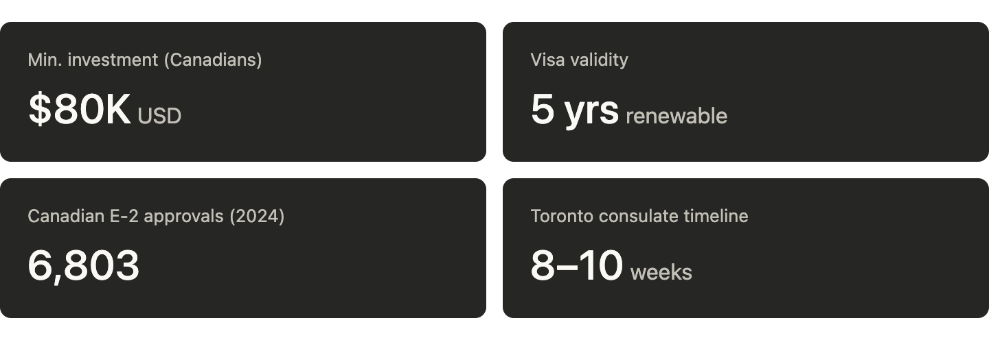 Unlike most E-2 nationalities, Canadians do not file a petition with USCIS before going to a consulate. The application is processed directly at the U.S. Consulate in Toronto, which shortens the overall timeline considerably.